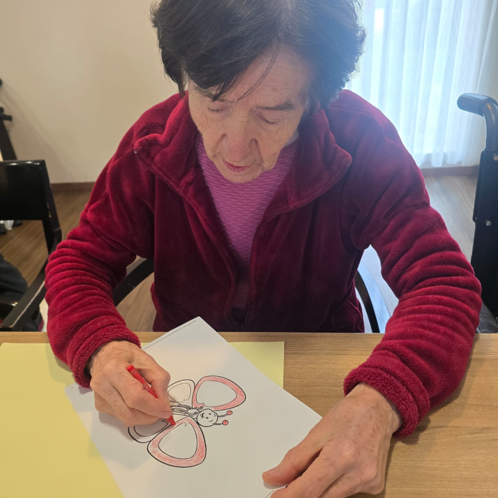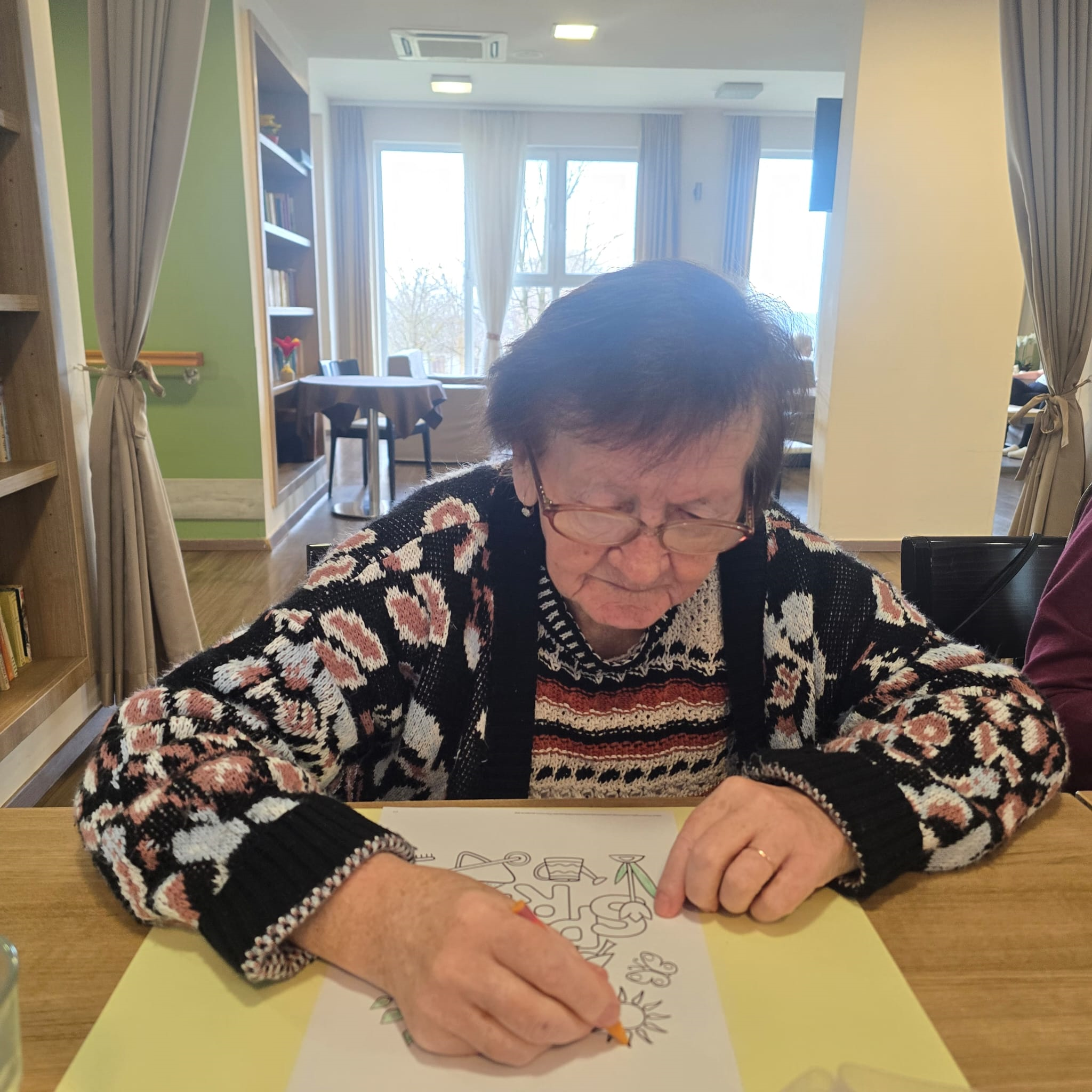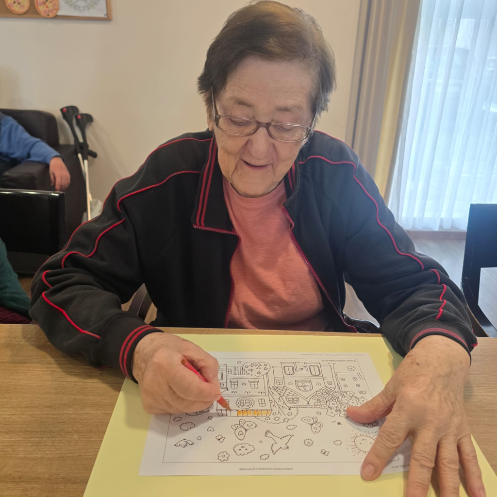 Tijekom radionice korisnici su pažljivo pratili oblike na papiru te ih ispunjavali različitim bojama, stvarajući vedre i razigrane motive. Ovakve aktivnosti pomažu u održavanju koordinacije pokreta ruku, ali i pružaju priliku za opuštanje i izražavanje kreativnosti.