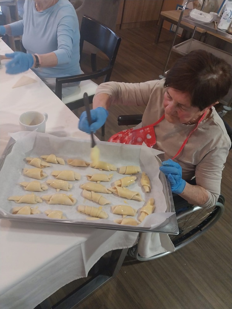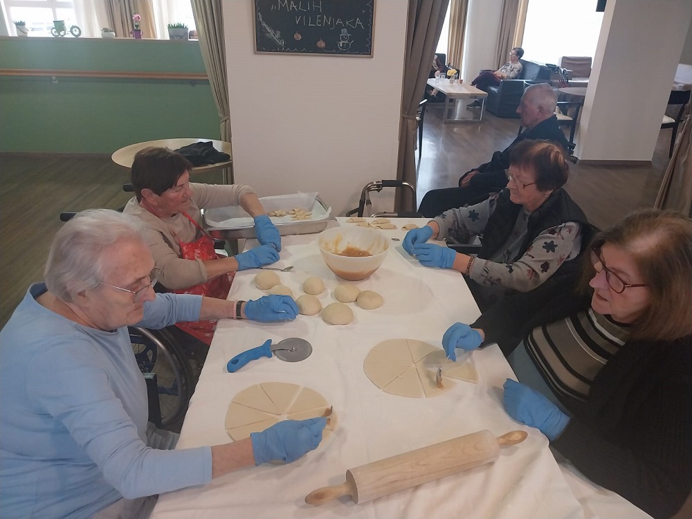 Korisnici SeneCura doma za starije Novaki Bistranski sudjelovali su u kulinarskoj radionici izrade roščića – prhkih kiflica punjenih marmeladom. Korisnici su zasukali rukave, mijesili i valjali tijesto te ga potom punili marmeladom i savijali u roščiće. Miris toplih pečenih roščića širio se hodnicima našeg doma pa smo ih tako toplo pečene poslužili na degustaciju našim dragim korisnicima.
