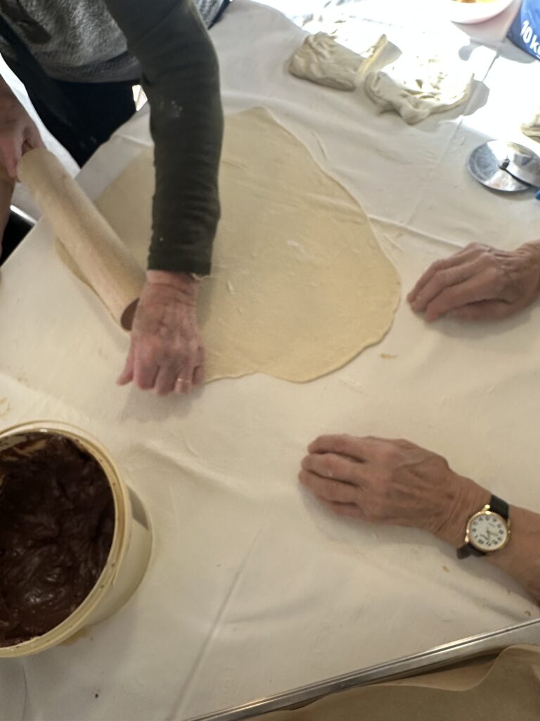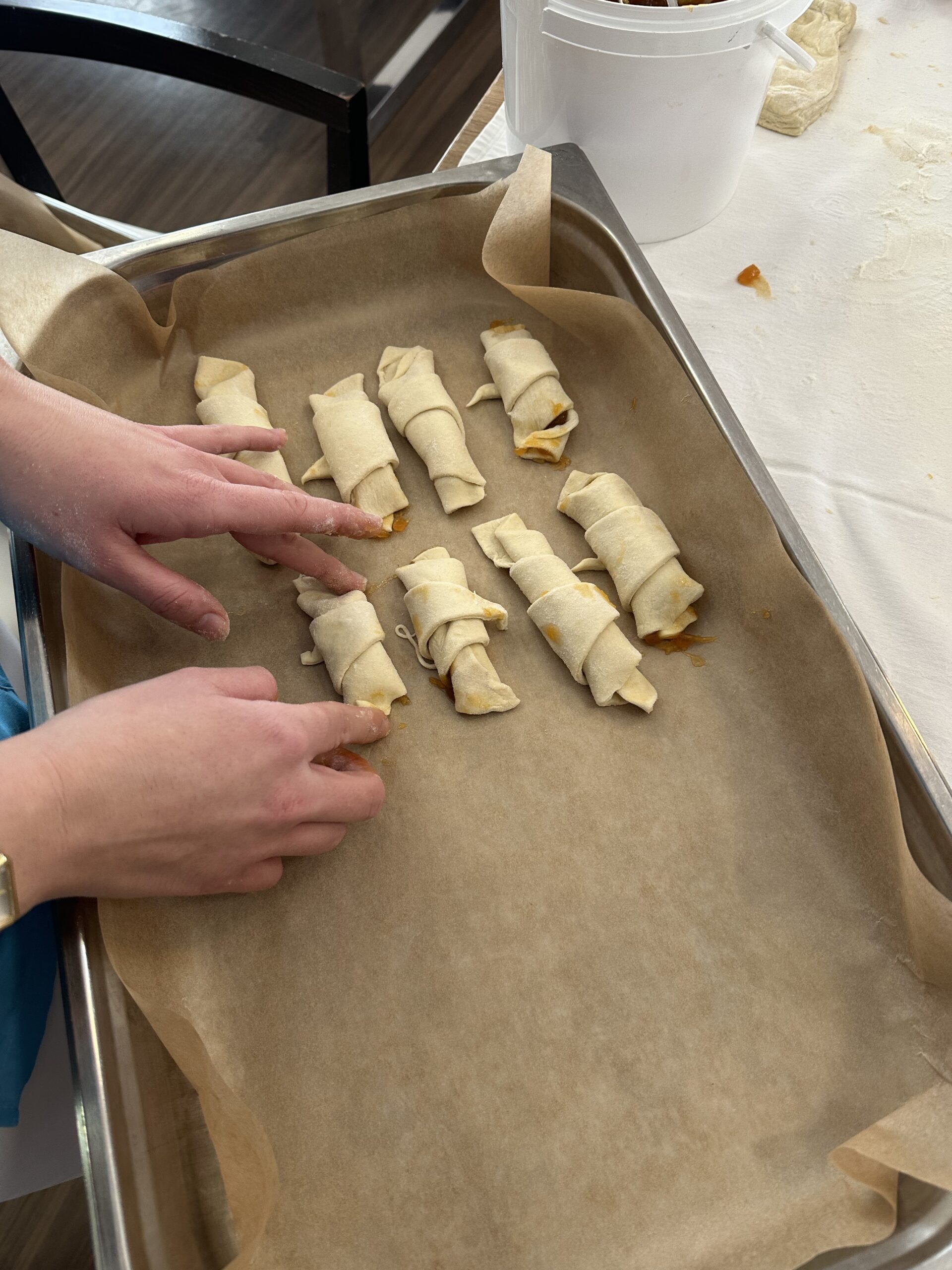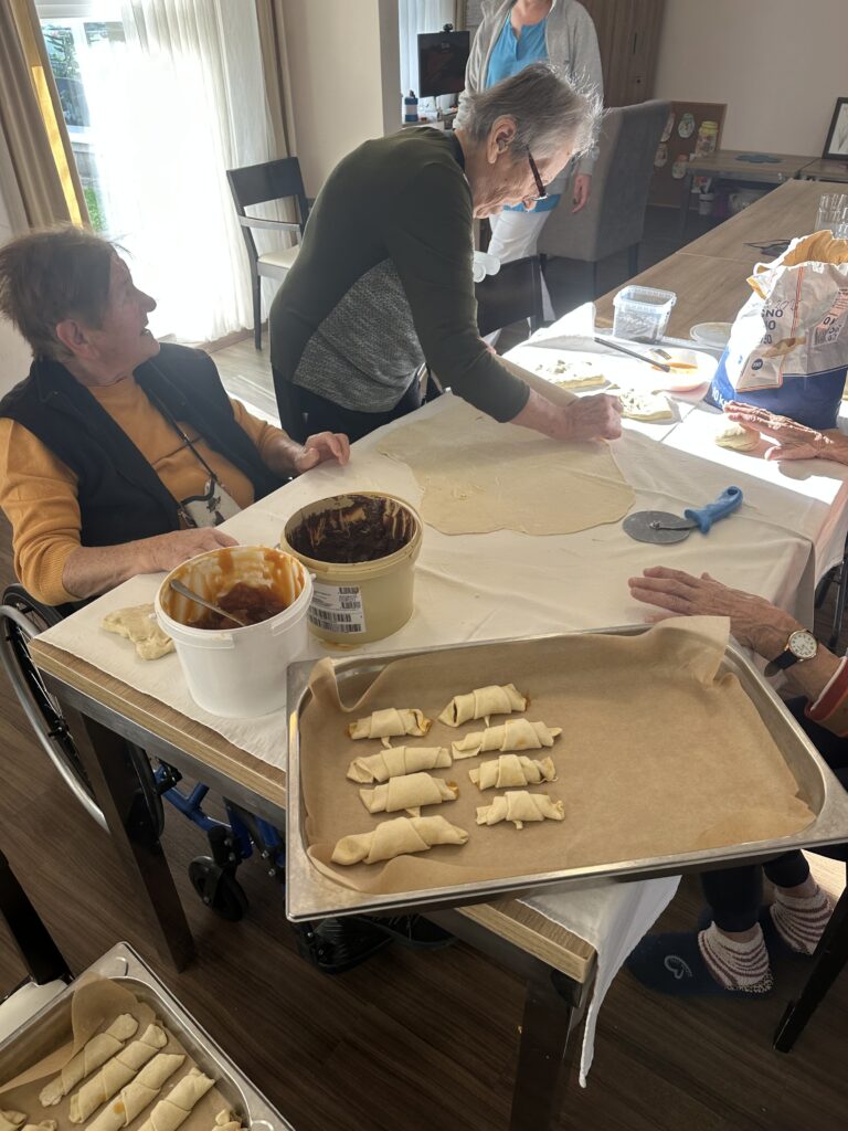 Slatko druženje nastavilo se i uz pripremu kroasana s čokoladom i marmeladom. Mirisi svježe pripremljenih slastica ispunili su prostor doma i potaknuli razgovor među korisnicima. Ovakve aktivnosti često potiču spontanu komunikaciju i razmjenu sjećanja vezanih uz kuhanje i obiteljska okupljanja.